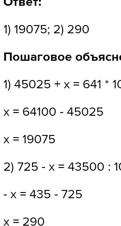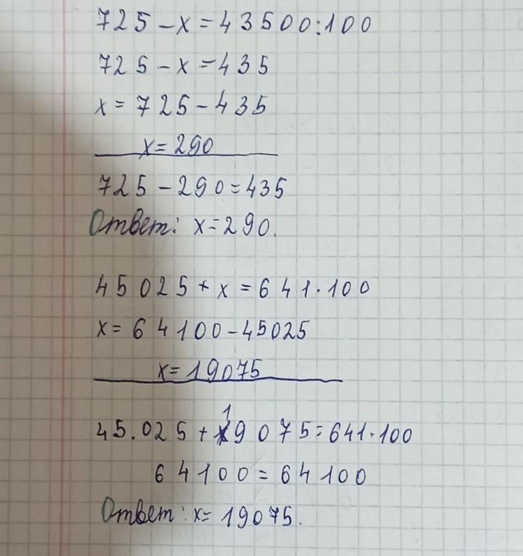 . Реши уравнения: 45 025 + x = 641-100 725 - x=43 500 : 100