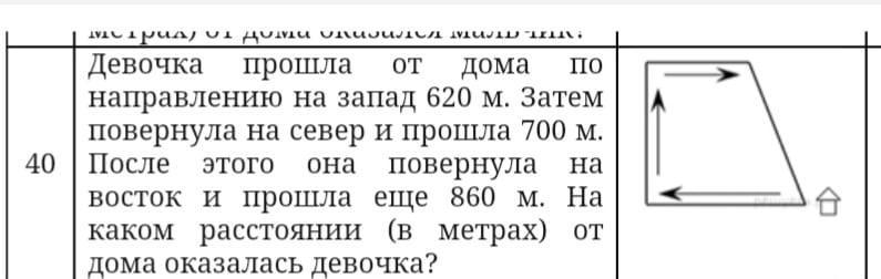 Девочка прошла от дома по направлению на запад 620 м. Затем повернула на север и прошла 700 м.