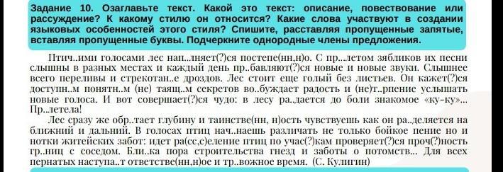 Задание 10. Озаглавьте текст. Какой это текст: описание, повествование или рассуждение? К какому стилю он относится? Какие слова участвуют в создании языковых особенностей этого стиля? Спишите, расставляя пропущенные запятые, вставляя пропущенные буквы. Подчеркните однородные члены предложения. Птич..ими голосами лес на..няет(?)ся постепе(нн.н)о. С пр...летом зябликов их песни слышны в разных местах и каждый день пр..бавляют(?)ся новые и новые звуки. Слышнее всего переливы и стрекотан..е дроздов. Лес стоит еще голый без листьев. Он кажет(?)ся доступным понятн..м (не) таящ..м секретов во..буждает радость и (не)т..рпение услышать новые голоса. И вот совершает(?)ся чудо: в лесу радается до боли знакомое «ку-ку»... Пр..летела! Лес сразу же обр..тает глубину и таинственн, н)ость чувствуешь как он ра..деляется на ближний и дальний. В голосах птиц нач..наешь различать не только бойкое пение но и нотки житейских забот: идет ра(cc,c)еление птиц по учас(?)кам проверяет(?)ся проч(?)ность гр..ниц с соседом. Бли..ка пора строительства гнезд и заботы о потомств... Для всех пернатых наступа..т ответстве(нн,н)ое и тр..вожное время. (С. Кулигин)