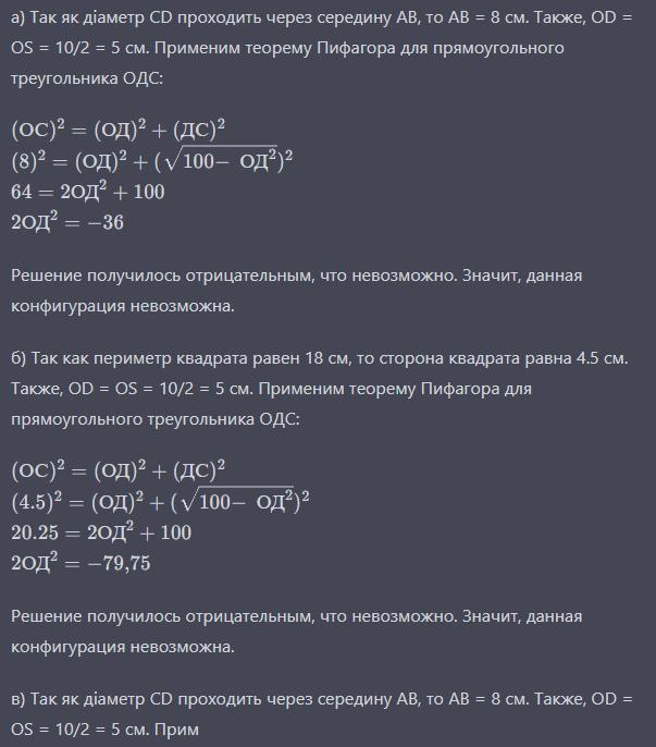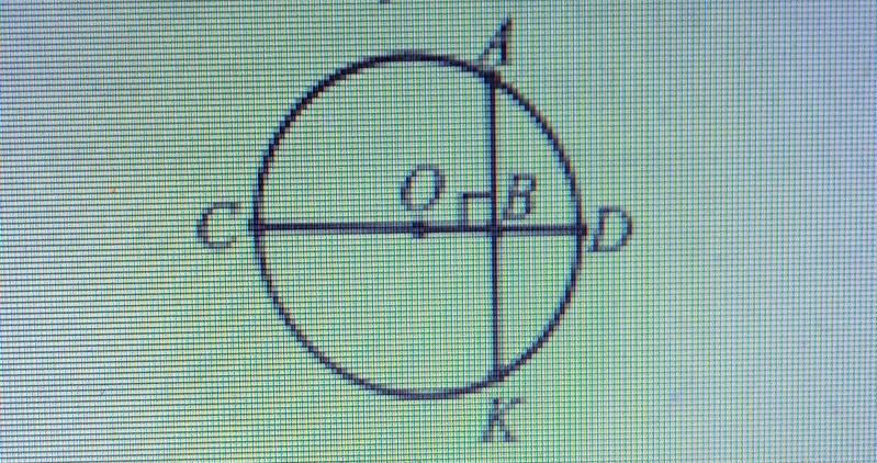 Діаметр CD кола перпендикулярний до хорди АК. За рисунком знайти довжину хорди АК, якщо АВ = 8 см, ОС=10 см. а) 11 см б) 4 см; в) 16 см;