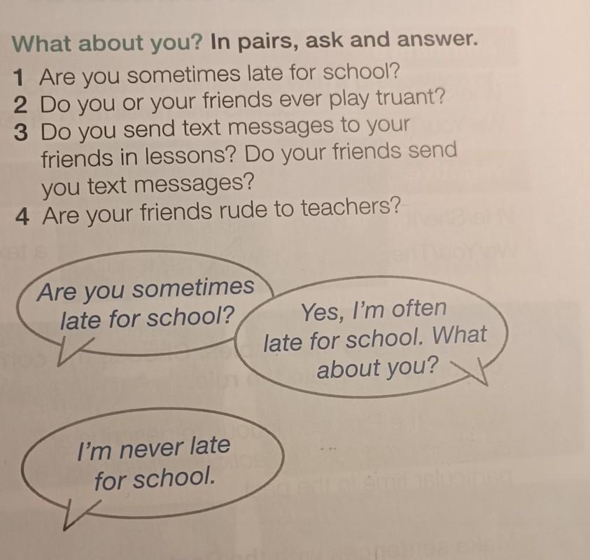 4 What about you? In pairs, ask and answer. 1 Are you sometimes late for school? 2 Do you or your friends ever play truant? 3 Do you send text messages to your friends in lessons? Do your friends send you text messages? 4 Are your friends rude to teachers? Are you sometimes late for school? I'm never late for school. Yes, I'm often late for school. What about you?