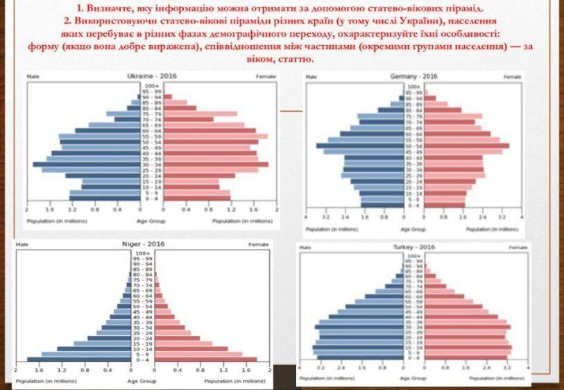 Охарактеризувати статево - вікові піраміди України, Німеччини, Туреччини та Нігер.