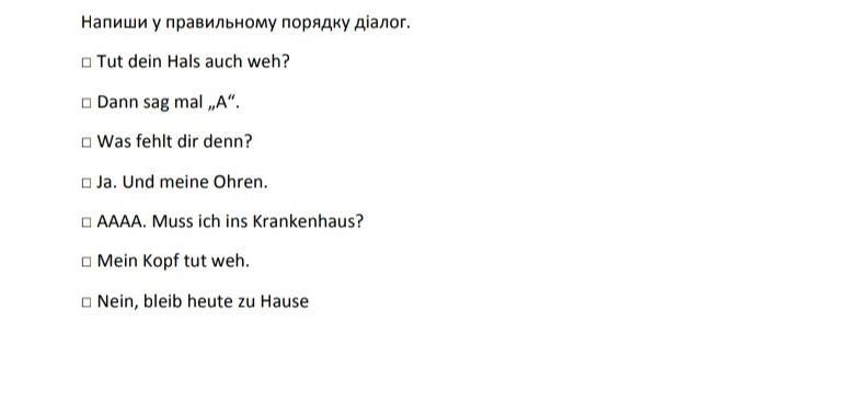 Напиши у правильному порядку діалог. Tut dein Hals auch weh? Dann sag mal ,A“. ☐Was fehlt dir denn? Ja. Und meine Ohren. □AAAA. Muss ich ins Krankenhaus? □ Mein Kopf tut weh. □ Nein, bleib heute zu Hause