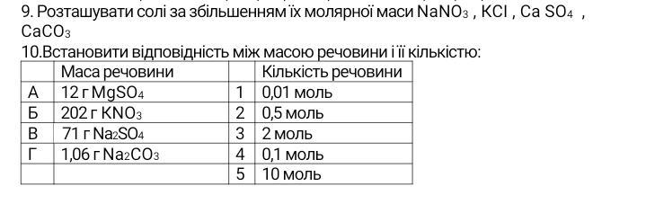 9. NaNO3(84,9), CaCO3(100), CaSO4(136), KCI(178). У дужках молярна маса.