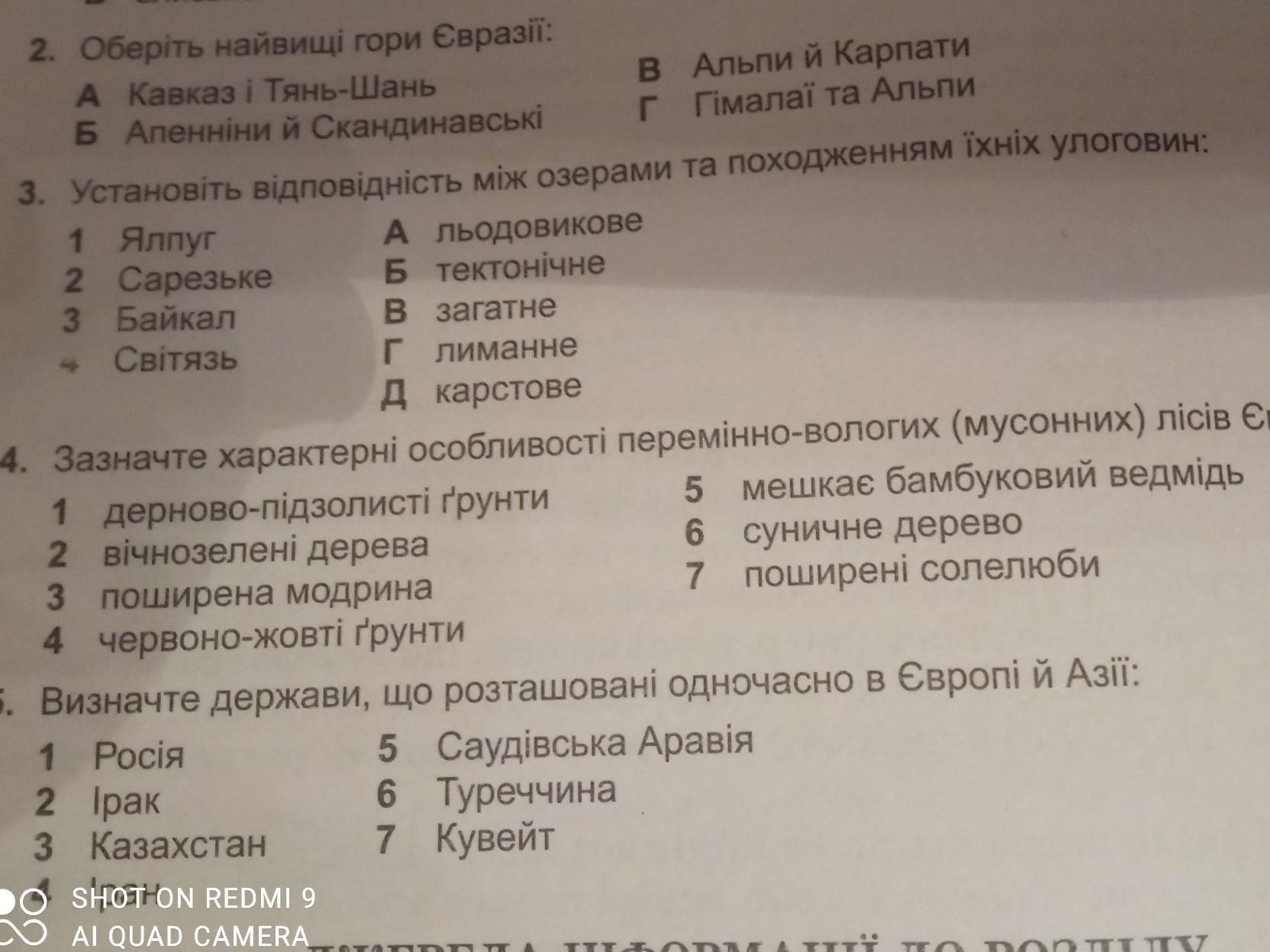 1. Визначте площу Євразії: А близько 35 млн км² Б близько 45 млн км² 2. Оберіть найвищі гори Євразії: А Кавказ і Тянь-Шань Б Апеннiни й Скандинавські В близько 55 км² Г близько 65 млн км2 3. Установіть вiдповiднiсть мiж озерами та походженням їхніх улоговин: 1 Ялпуг 2 Сарезьке 3 Байкал 4 Світязь 1 дерново-підзолисті ґрунти 2 вічнозеленi дерева в Альпи й Карпати Г Гімала? та Альпи А льодовикове Б тектонічне в загатне Г лиманне Д карстове 4. Зазначте характерні особливості перемiнно-вологих (мусонних) лісів Євразії: 5 мешкає бамбуковий ведмідь 6 суничне дерево 7 поширені солелюби 1 Росiя 2 Ipak 3 Казахстан 4 Іран 3 поширена модрина 4 червоно-жовті ґрунти 5. Визначте держави, що розташовані одночасно в Європі й Аз 5 Саудівська Аравія 6 Туреччина 7 Кувейт ПОМОГИТЕ!НЕ ИГНОРТЕ!!!!!!СРОЧНО ПОМОЩЬ!
