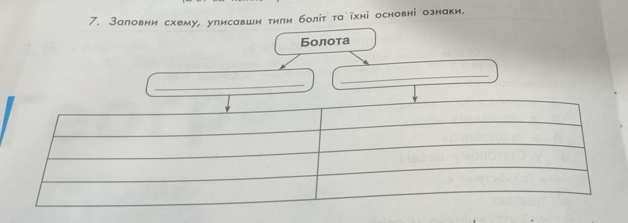 7. Заповни схему, уписавши типи боліт та їхні основні ознаки. Болота