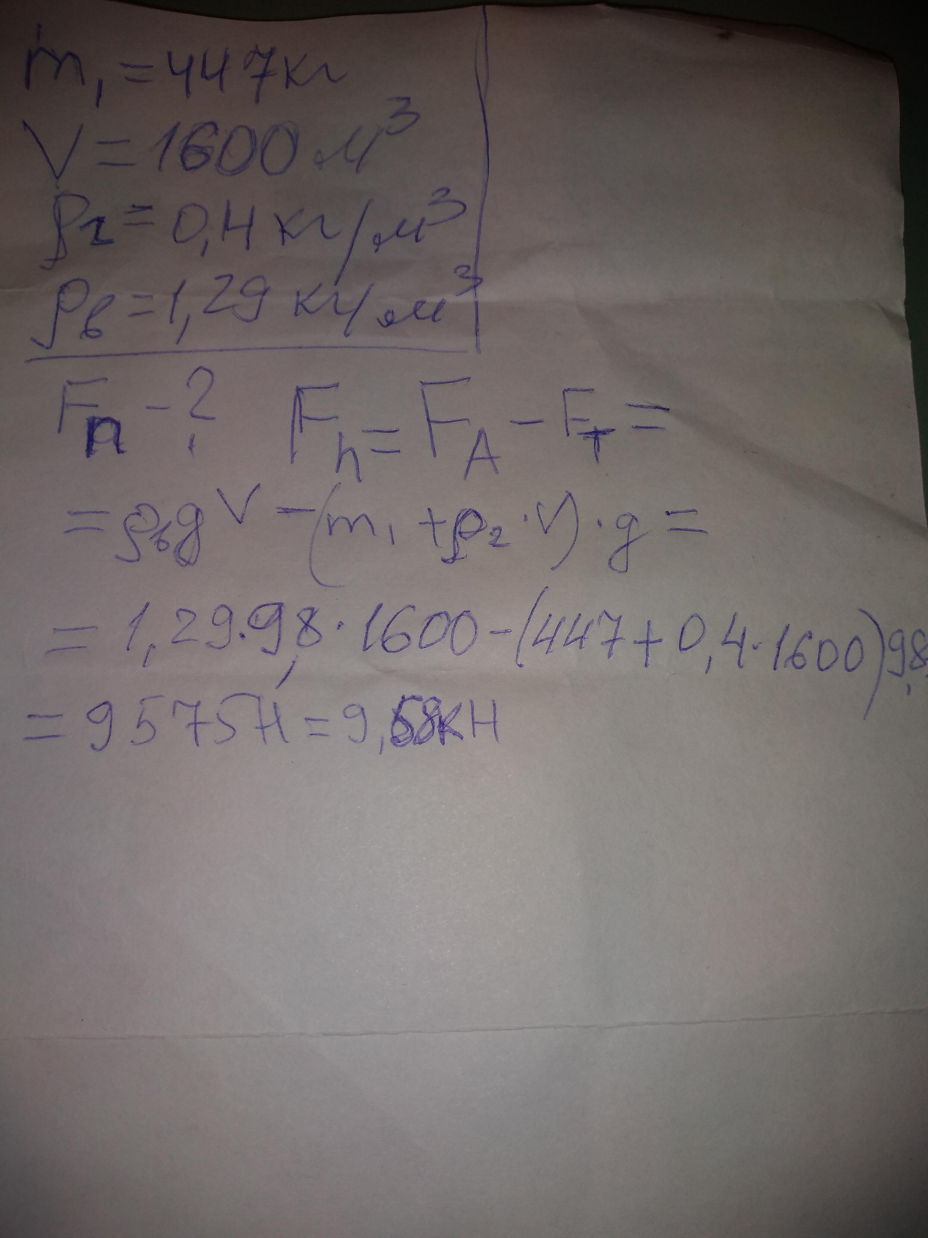 Маса спорядження повітряної кулі (оболонки сітки, кошика) становить 447 кг. Об'єм кулі - 1600 м3. Розрахуй, яку підйомну силу буде мати ця куля при наповненні її світильним газом. (Вважай густину газу 3 Рсвітильного_газу — 0,4кг/м³ та g = 9,8 H/ кг).