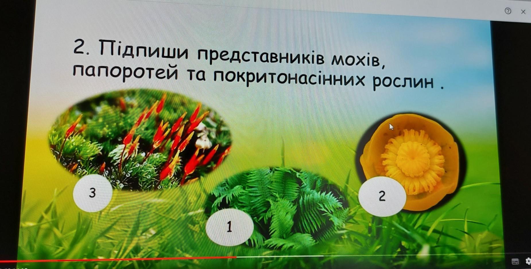 Ответ: 1)—Мох 2) Папоротні , 3) Насіння