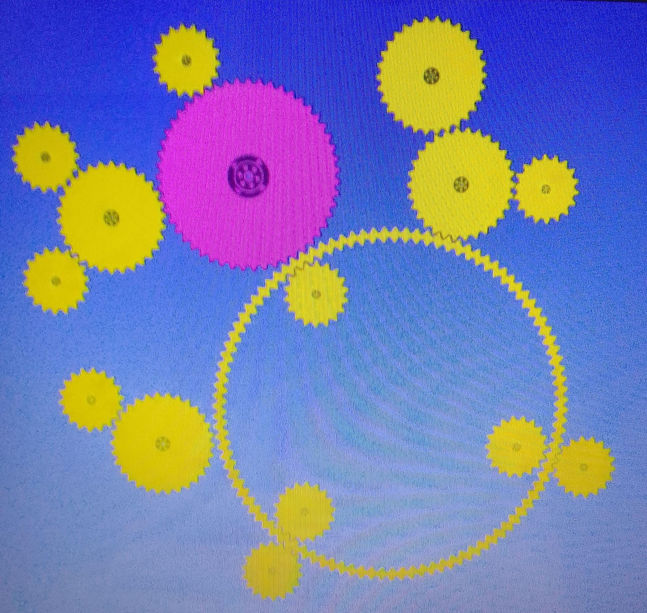 Посмотрите на изображение. Розовая шестеренка вращается по часовой стрелке, приводя все остальные шестеренки в движение. Посчитайте и напишите количество шестеренок, которые вращаются против часовой стрелки.