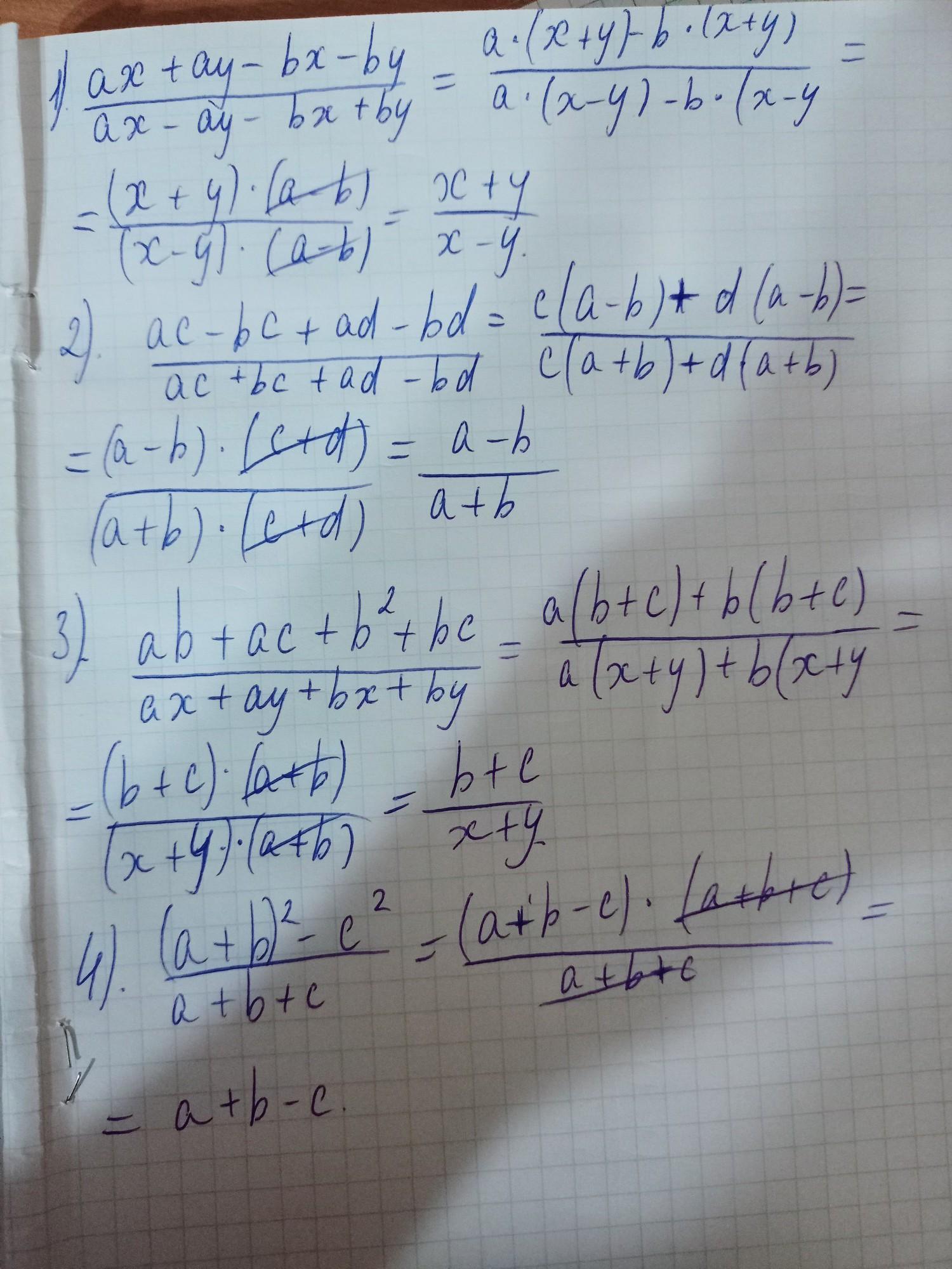 6.23. Сократите дробь: ax + ay-bx-by ax-ay-bx + by ; 1) 2) ac - bc + ad - bd ; ac + bc + ad + bd 3) Me 4) ab + ac + b² + bc ax + ay+bx+by 2 (a + b)² - c² a+b+c ;
