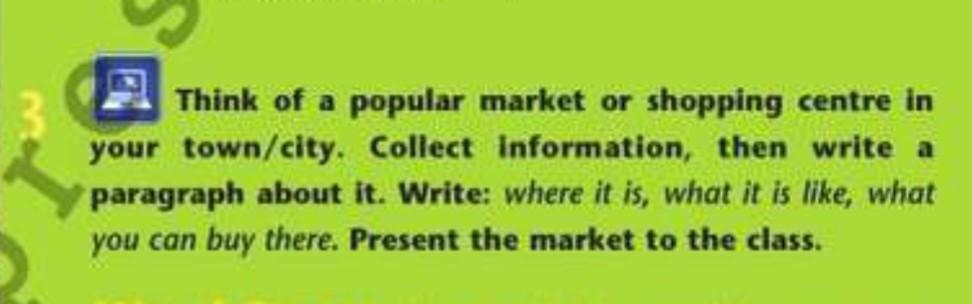 Think of a popular market or shopping centre in your town/city. Collect information, then write a paragraph about it. Write: where it is, what it is like, what you can buy there. Present the market to the class.