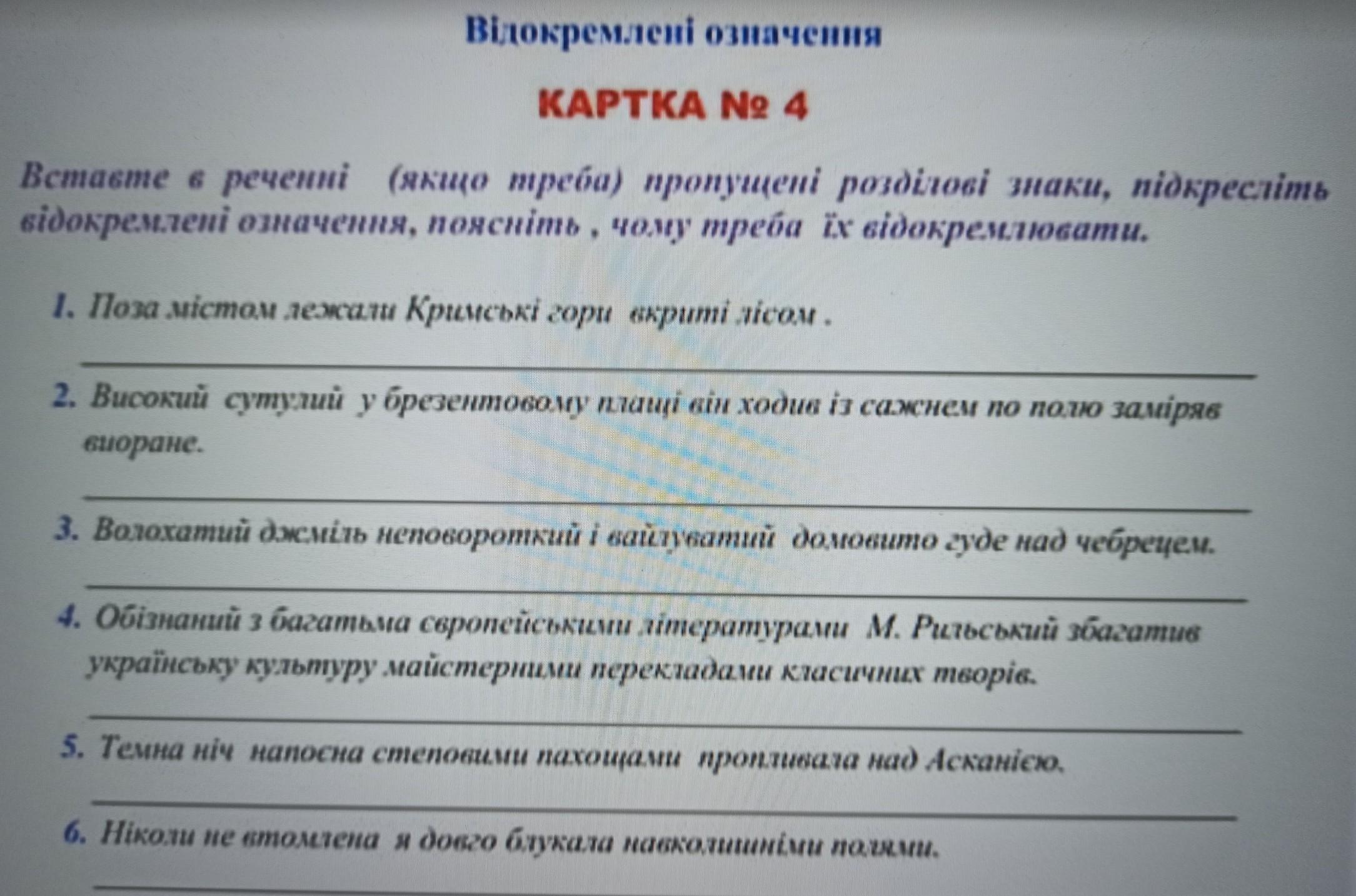5. Темна ніч напоїлася степовими пахощами і пропливала над Асканією. (Не потрібно відокремлювати жодне означення в цьому реченні.)