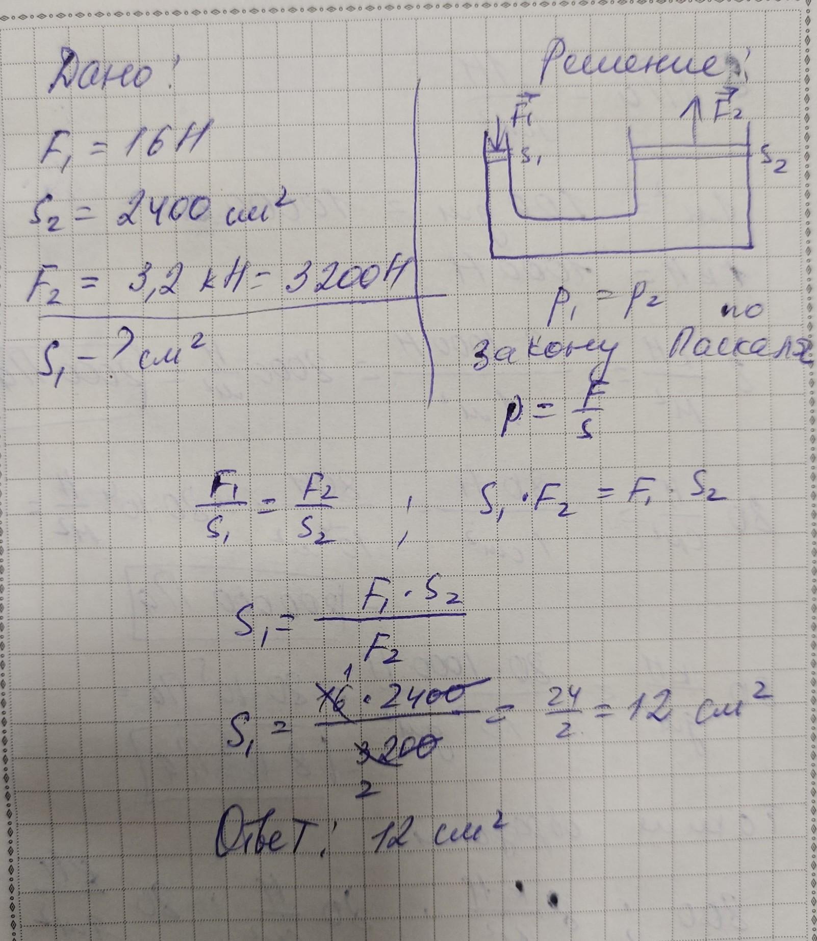 більший поршень площею 2400 см 2 передається сила тиску 3,2 кН. Яка площа