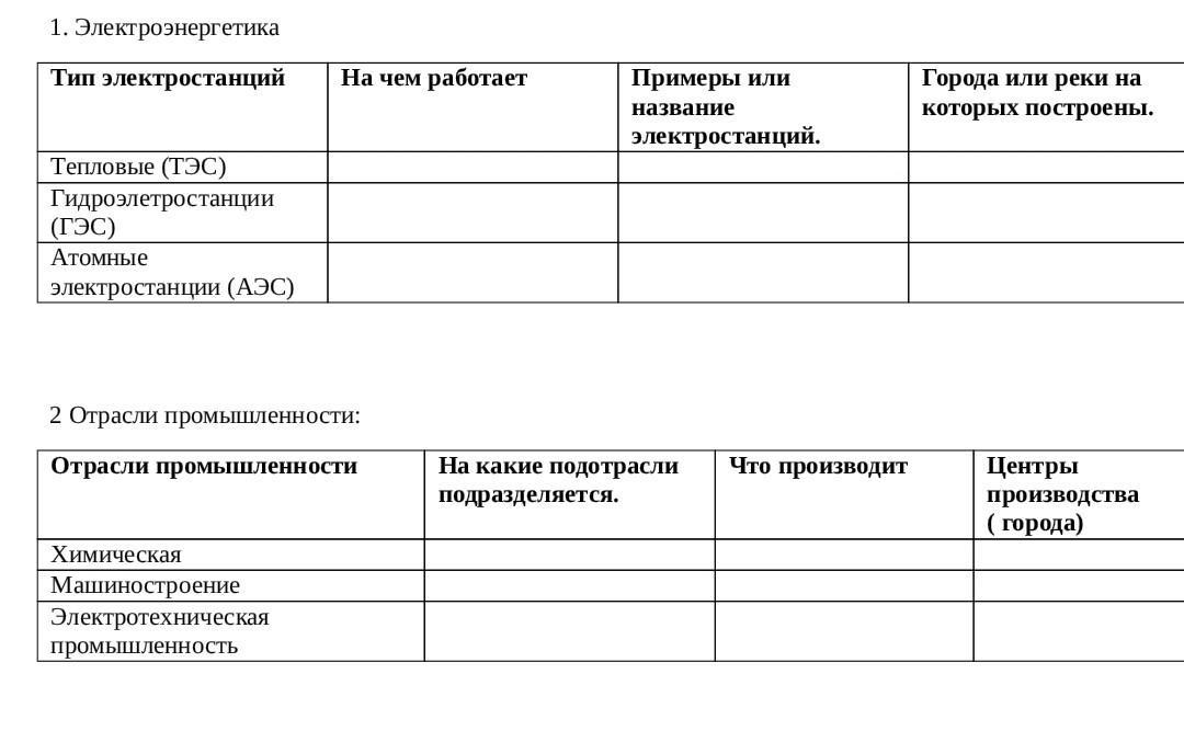 пожалуйста помогите срочно 50 баллов даю 1. Электроэнергетика Тип электростанций Тепловые (ТЭС) Гидроэлетростанции (ГЭС) Атомные электростанции (АЭС) На чем работает 2 Отрасли промышленности: Отрасли промышленности Химическая Машиностроение Электротехническая промышленность Примеры или название электростанций. На какие подотрасли Что производит подразделяется. Города или реки на которых построены. Центры производства ( города)