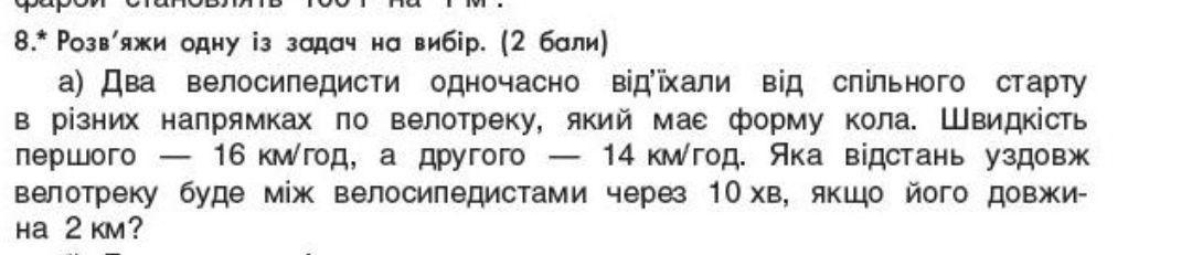 За 10 хв перший велосипедист проїде 16/6 = 2,67 км, другий - 14/6 = 2,33 км (тут використано формулу швидкості, V = S/t, де S - відстань, t - час в годинах, а відстань знайдено з формули довжини кола, P = 2πr = 2 * 3,14 * 1 = 6,28 км).