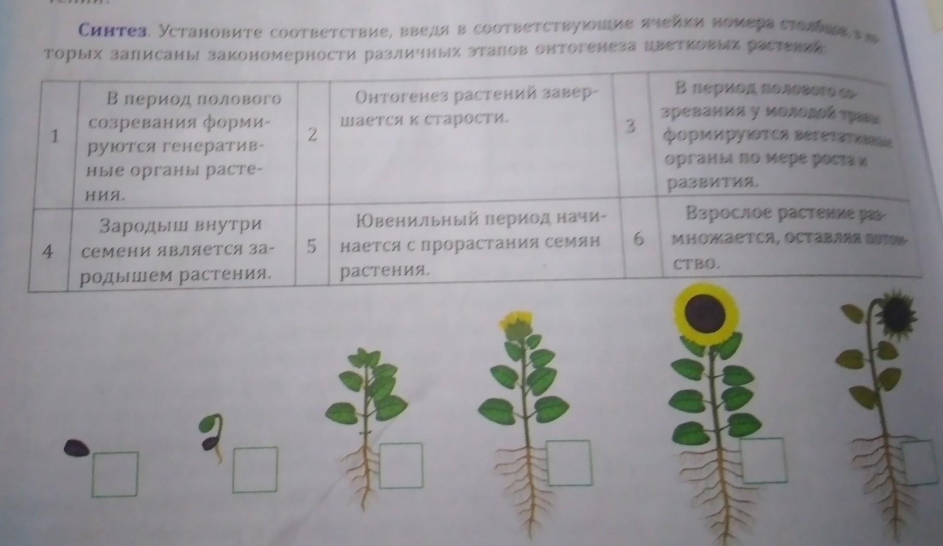 Синтез . Установите соответствие, введя в соответствующие ячейки номера столбцов, в которых записаны закономерности различных этапов онтогенеза цветковых растений: