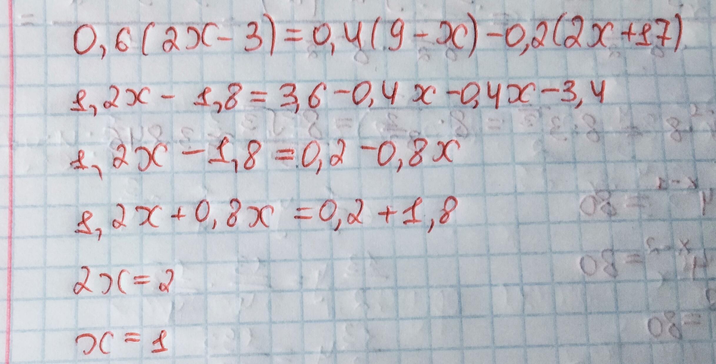 0,6(2х-3)=0,4(9-х)-0,2(2х+17)
