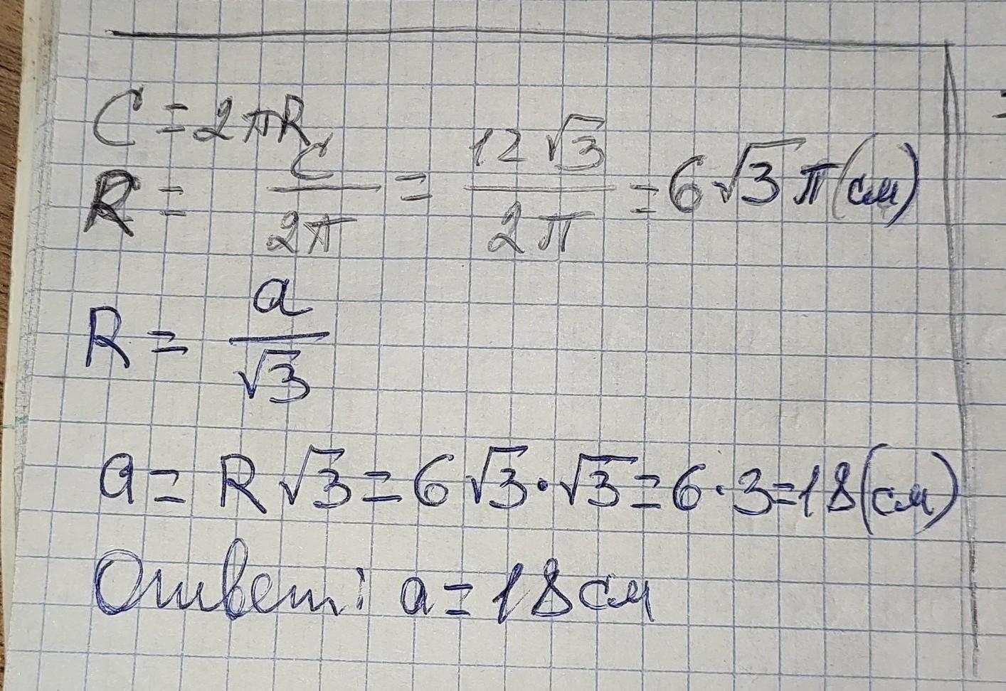 С=2пR=12√3п, звідси R=6√3 cм. R=а√3/3=6√3, звідси а =18 см.