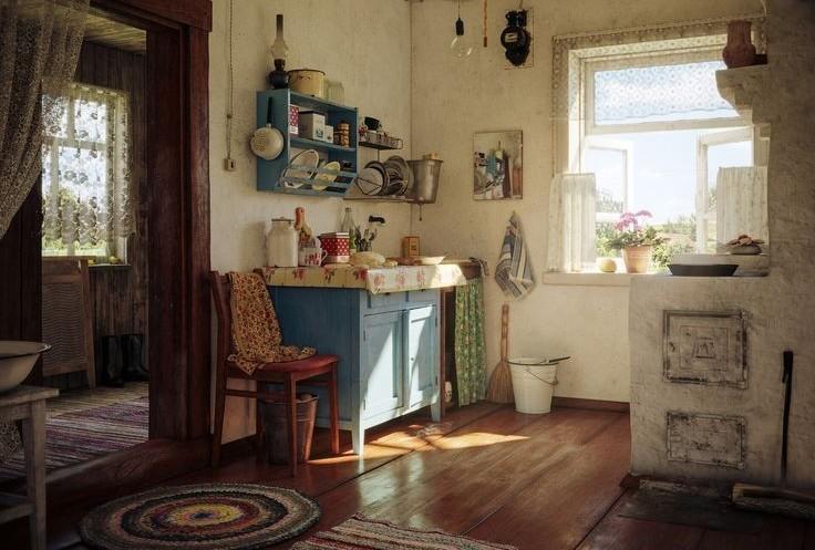 Перше ми бачимо піч з двома дверцями , яка займає чверть кухні. Попід самою стелею , на печі стоїть глечик .Підлога дерев'яна , стіни-побілені. Поряд з тумбочкою , сховався рукомийник, поряд з ним, недалеко від вікна, на стіні вісить дзеркало. Під дзеркалом- вісить рушник . А поряд з рукомийником , стоЇть відерце та віник.