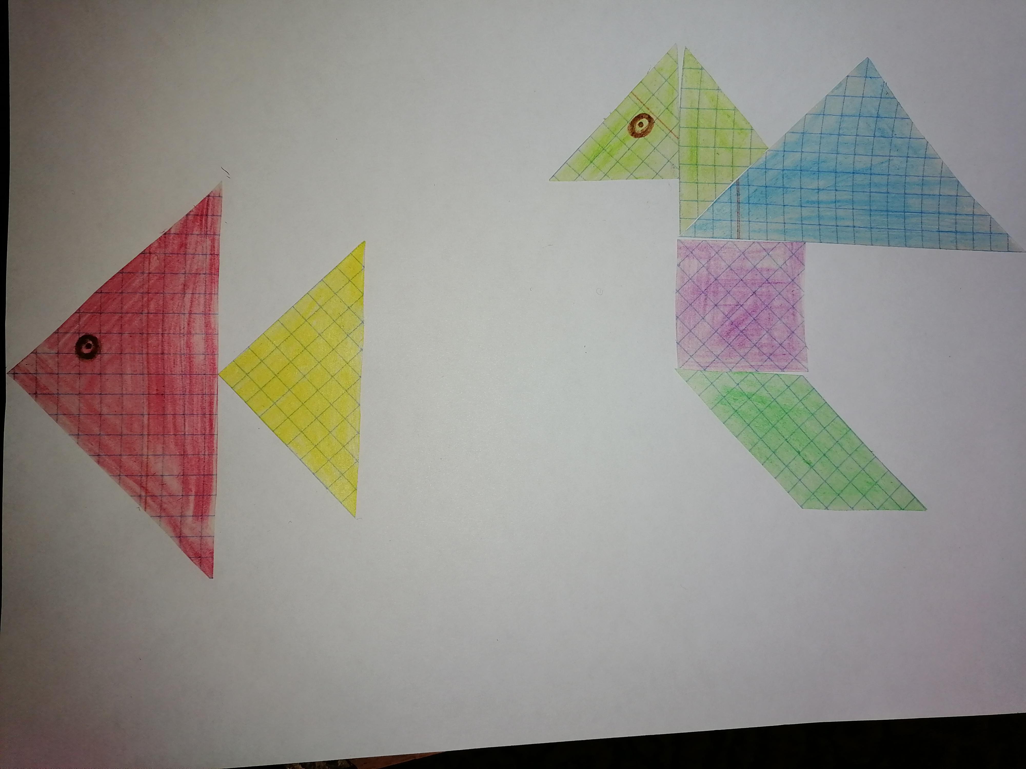 1 3. Игра Танграм». Вырежь из бумаги 7 фигур - части большого квадрата из задания 2. Составь из них компози- ции, похожие на силуэты птицы, рыбы.