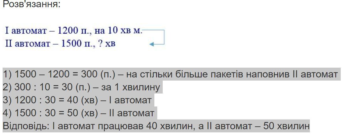 На молокозаводі провели тестування двох нових автоматів, які працюють з однаковою продуктивністю. Перший автомат наповнив молоком 1200 па- кетів, а другий 1500. Перший автомат працював на 10 хв менше, ніж другий. Скільки хвилин працював кожний автомат?