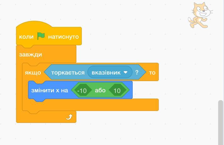 короче як це працює виходить коли вказівник=мишка торкається спрайту=кіт тоді кіт змінює х=горизонталь в перед або назад тобто 10=вперед -10=назад