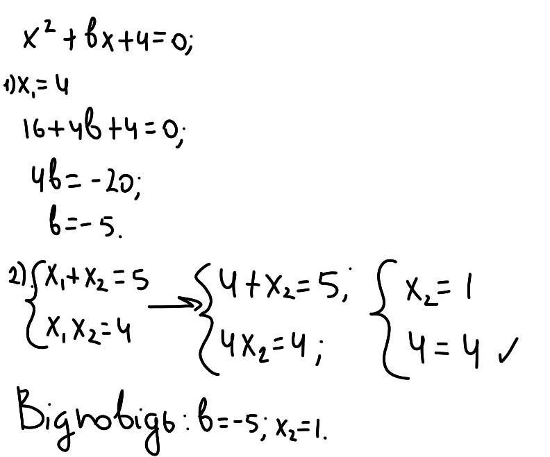 число 4 є коренем рівняння x²+ bx+4 =0 .Знайти значення b і другий корінь рівняння