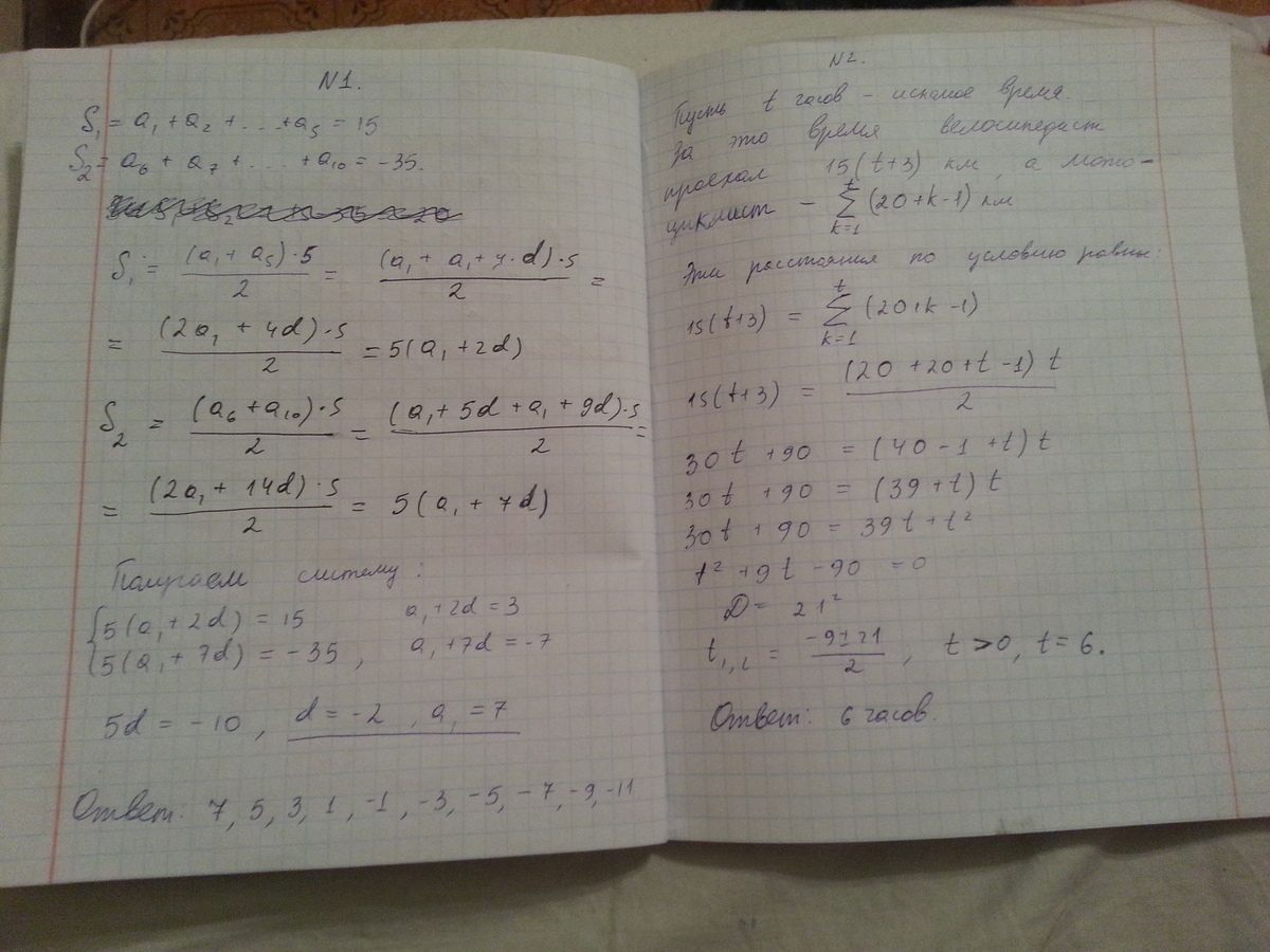 2)Из пункта А выехал велосипедист со скоростью 15 км в час. Спустя 3 часа вслед ему отправился мотоциклист,который в первый час проехал 20 км и в каждый следующий час проезжал на 1 км больше,чем в предыдущий. Сколько часов потребовалось мотоциклисту,чтобы догнать велосипедиста?