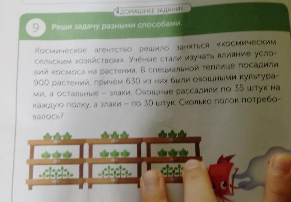 ДОМАШНЕЕ ЗАДАНИЕ 9 Реши задачу разными способами. Космическое агентство решило заняться «космическим сельским хозяйством». Учёные стали изучать влияние усло- вий космоса на растения. В специальной теплице посадили 900 растений, причём 630 из них были овощными культура- ми, а остальные - злаки. Овощные рассадили по 35 штук на каждую полку, а злаки - по 30 штук. Сколько полок потребовалось?
