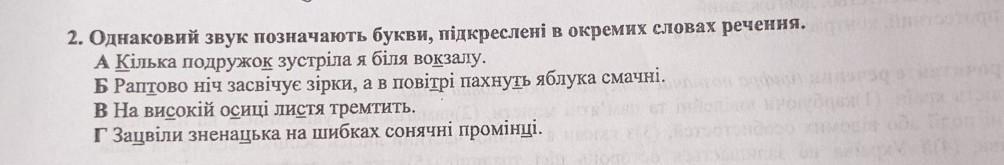 2. Однаковий звук позначають букви, підкреслені в окремих словах речення. А Кілька подружок зустріла я бiля вокзалу. Б Раптово нiч засвічує зірки, а в повітрі пахнуть яблука смачні. В На високій осиці листя тремтить. Г Зацвіли зненацька на шибках сонячні промінці.