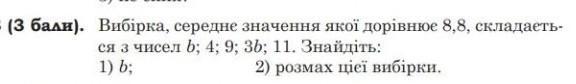 3 (3 бали). Вибірка, середне значення якої дорівнюе 8,8, складаеть- ся з чисел ь; 4; ; ; 1. Зіть: 1) b; 2) розмах цієї вибірки.