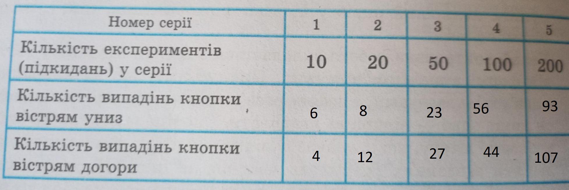 Експеримент полягає у підкиданні кнопки. Кнопка може впасти як вістрям донизу, так і на шляпку. Підкиньте кнопку: 1) 10 разів; 2) 20 разів; 3) 50 разів; 4) 100 разів; 5) 200 разів. Результати, отримані в п'яти серіях експериментів, занесіть у таблицю.