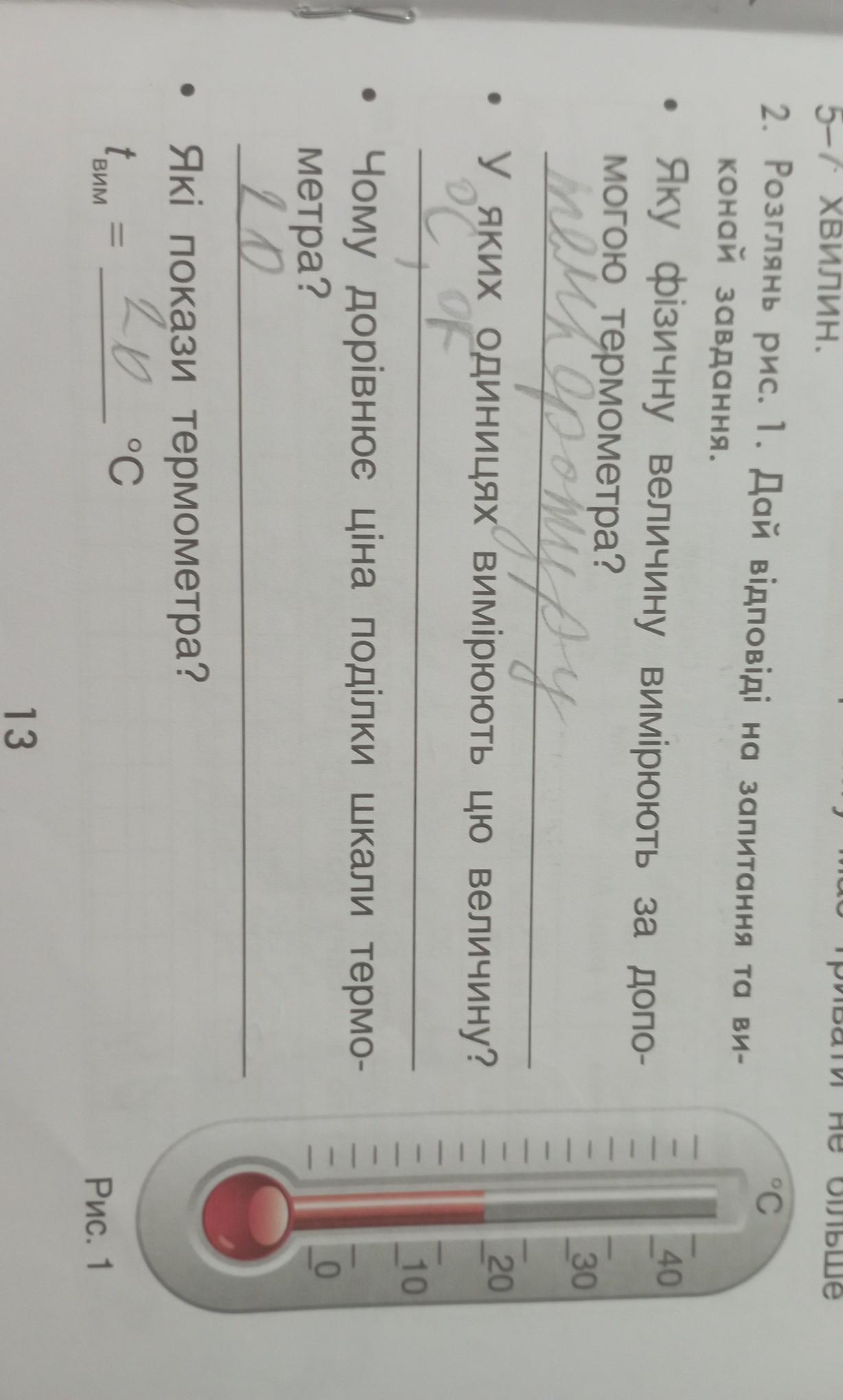 ● Мае тривати 5-7 хвилин. 2. Розглянь рис. 1. Дай відповіді на запитання та ви- конай завдання. Яку фізичну величину вимірюють за допо- могою термометра? у яких одиницях вимірюють цю величину? Чому дорівнює ціна поділки шкали термо- метра? Які покази термометра? Твим °C = 13 не більше °C 40 30 20 10 О Рис.