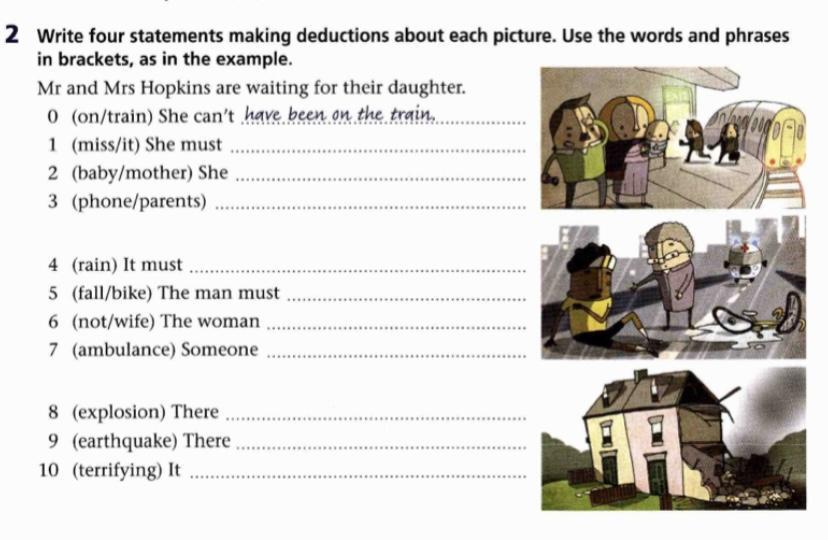 Write four statements making deductions about each picture. Use the words and phrases in brackets, as in the example.
