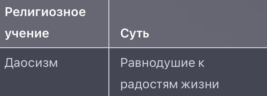 5. Заполните таблицу: «Религиозные учения Китая» Даосизм Религиозное учение Суть Равнодушие к радостям жизни