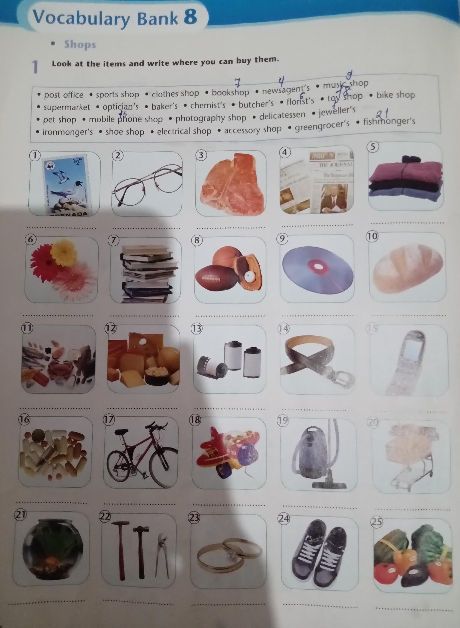7.bookshop 8.sportsshop 9.music shop 10.baker’s 11.supermarket 12.delicatessen 13.photography shop 14.accessory shop 15.mob phone shop 16.chemists 17.bike shop 18.toy shop 19.electrical shop 20. 21.pet shop 22.ironmongers 23.jewellrs 24.shoe shop 25.greengrocers