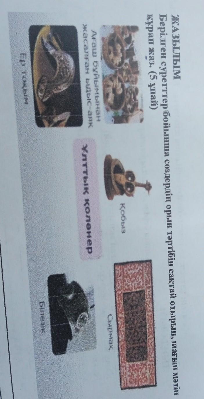 ЖАЗЫЛЫМ Берілген суретттер бойынша сөздердің орын тәртібін сақтай отырып, шағын мәтін құрап жаз. (5 ұпай) Акаш Буйымынан жасалган ыдык аяк Ep TORBIMa Кобыз Ұлттық қолөнер Сырмақ Binesik