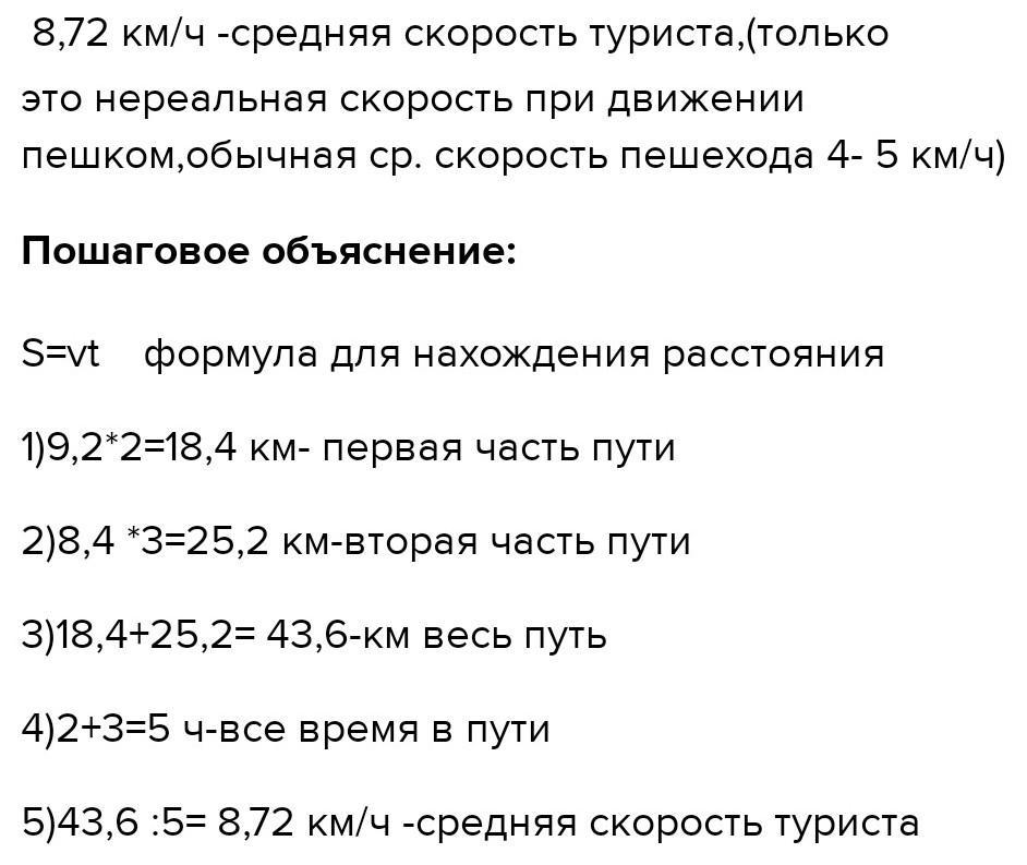 Турист 2год йшов зі швидкість 9,2км/год, а потім Згод йшов зі швидкістю 8,4км/год. Яка середня швидкість туриста була на всьому шляху?