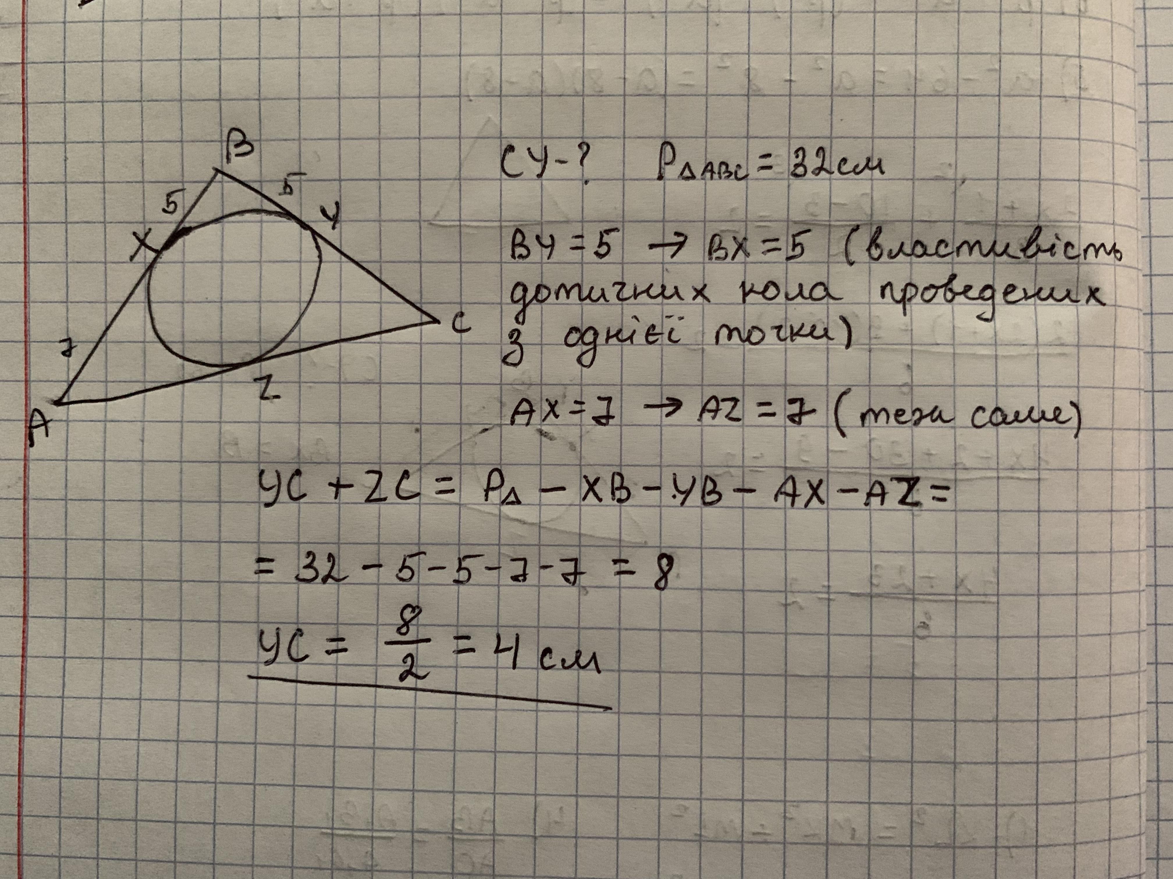 Объяснение: в дужках написано «за властивістю дотичних кола, проведених з однієї точки»