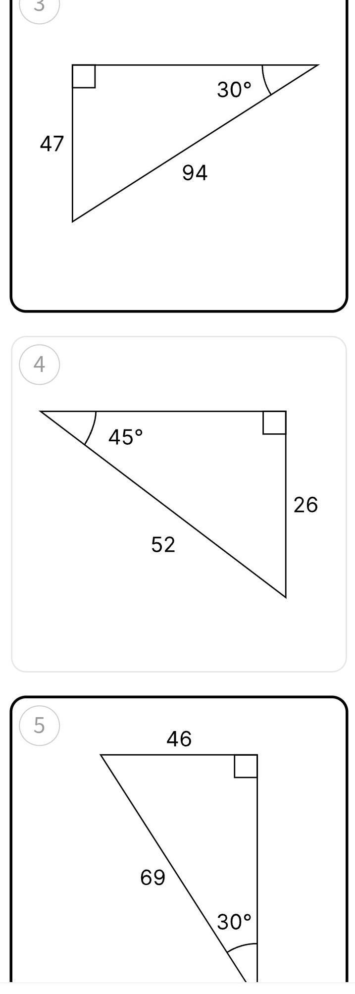 3) Катет 47, в два раза больше гипотенузы 94, угол против этого катета 30°