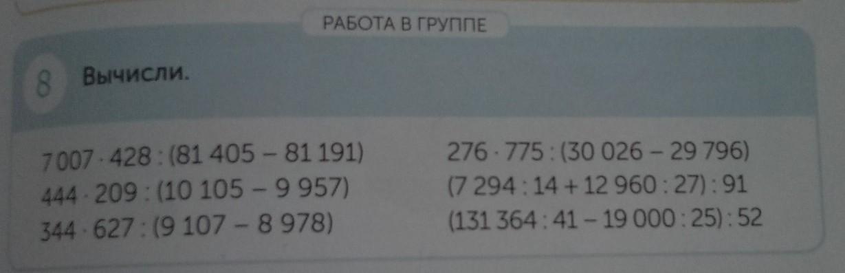 РАБОТА В ГРУППЕ 8 Вычисли 7007-428 (81 405-81 191) 444 209 (10 105 - 9 957) 344 627 (9107-8 978) 276-775: (30 026-29 796) (7 294:14 +12 960:27):91 (131 364:41-19 000:25):52 50 балов дам!!!