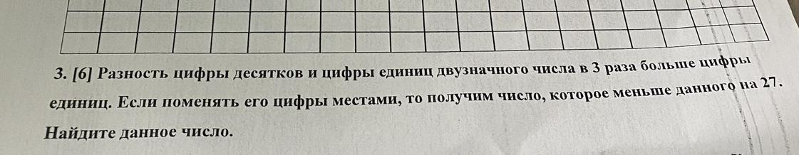 3. [6] Разность цифры десятков и цифры единиц двузначного числа в 3 раза больше цифры