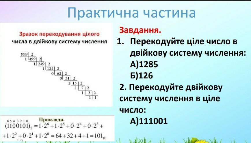 1. Перекодуйте ціле число в двійкову систему числення: A)1285