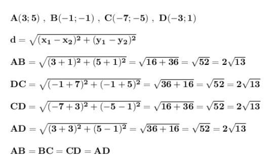 Доведіть що чотирикутник ABCD з вершинами в точках А(3 ; 5) В(-1;-1) С(-7;-5) і D(-3;1) є ромбом.