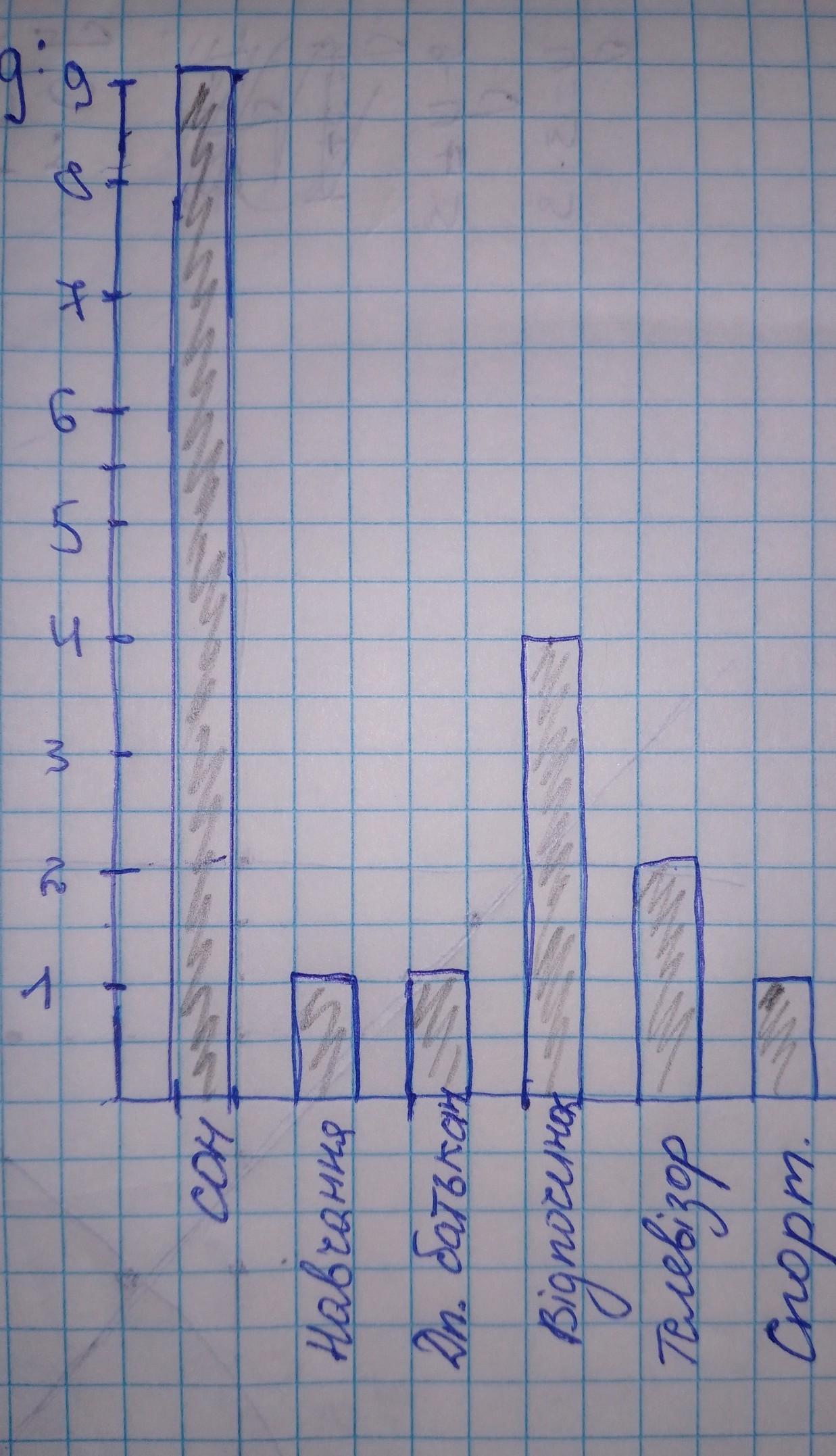 Побудуйте стовпчасту діаграму розподілу часу учня протягом доби, якщо на сон він витрачає 9 годин, на навчання виконання домашньої роботи – 1 годину, допомогу батькам- 1 годину, на відпочинок - 4 години, телевізор - 2 години, на заняття спортом - 1 годину. - 6 годин, . СРОЧНО !!!! БУДЬ ЛАСКА ДАЮ 40 БАЛІВ