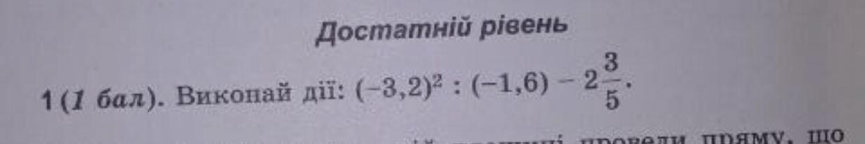 Третя дія: (-3,2)^2:(-1,6)-2 3/5 = 10,24 / (-1,6) - 4,2 = -6,4 - 4,2 = -10,6