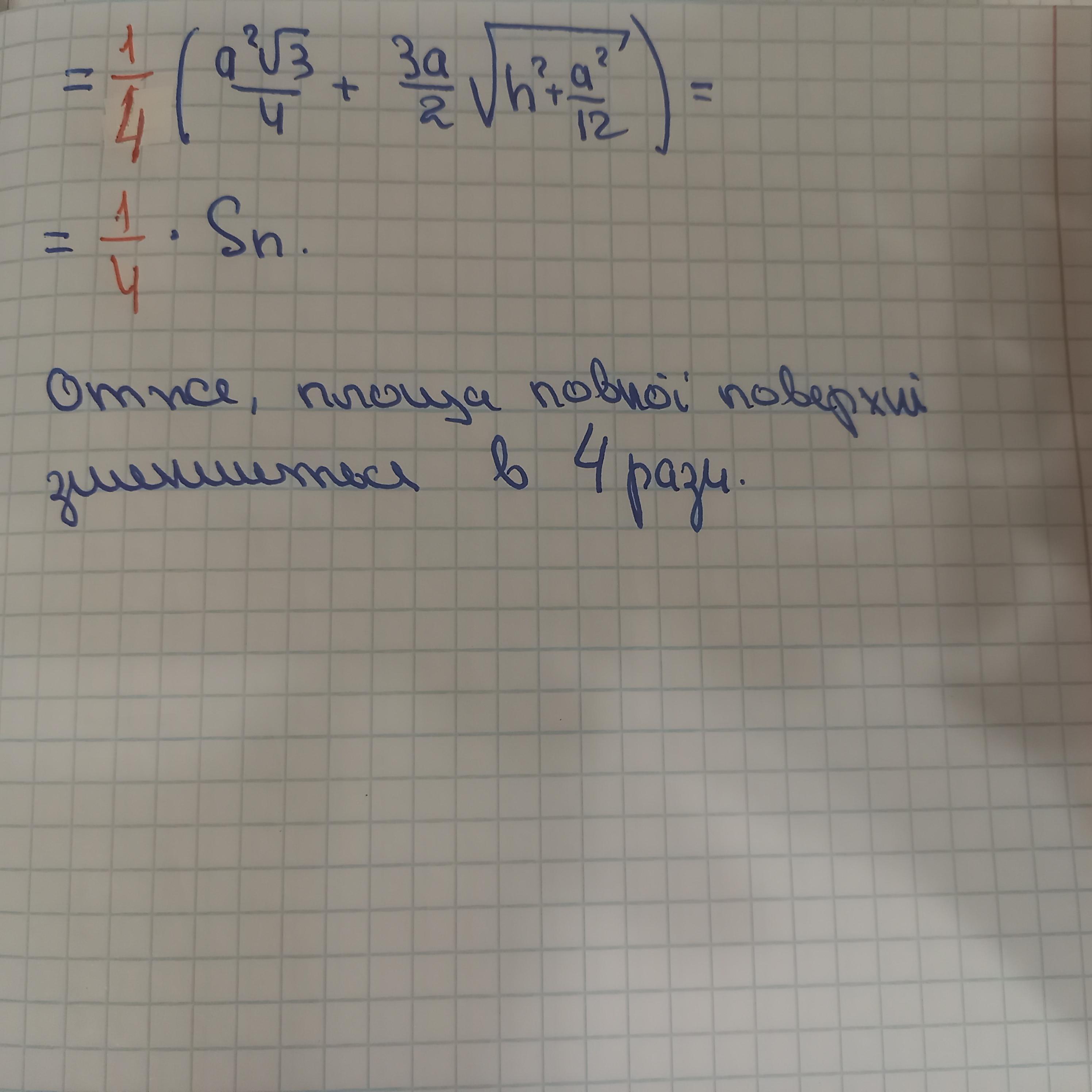 орону основи і висоту правильної трикутної піраміди зменшили у 2 рази. При цьому площа повної поверхні піраміди зменшиться в: