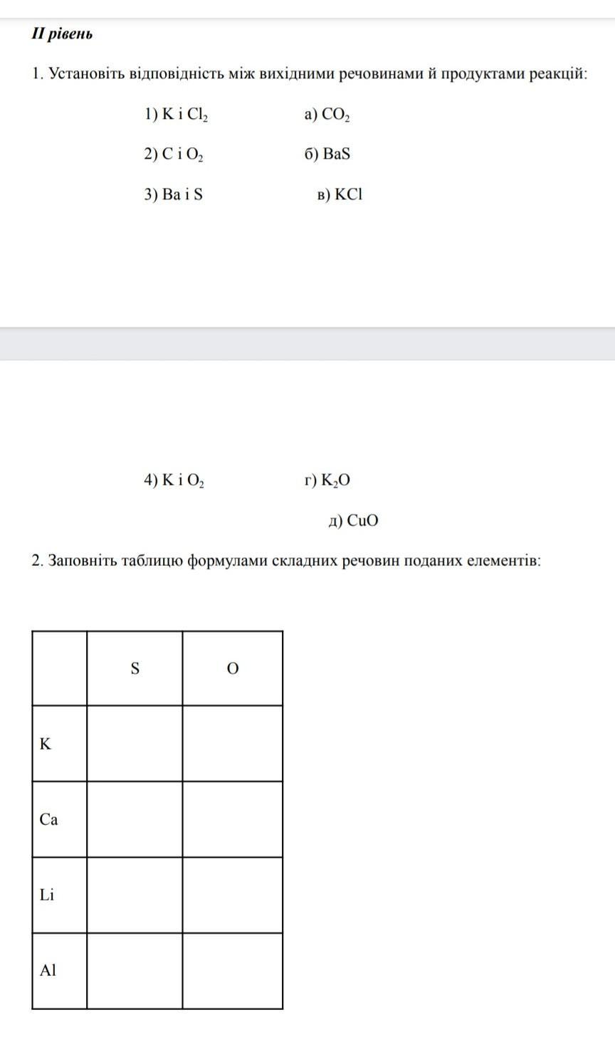 ІІ рівень 1. Установіть відповідність між вихідними речовинами й продуктами реакцій: K Ca Li Al 1) K i Clz 2) Cioz 3) Ba i S д) CuO 2. Заповніть таблицю формулами складних речовин поданих елементів: S 4) k i Oz a) CO₂ б) BaS 0 B) KCI г) К,0