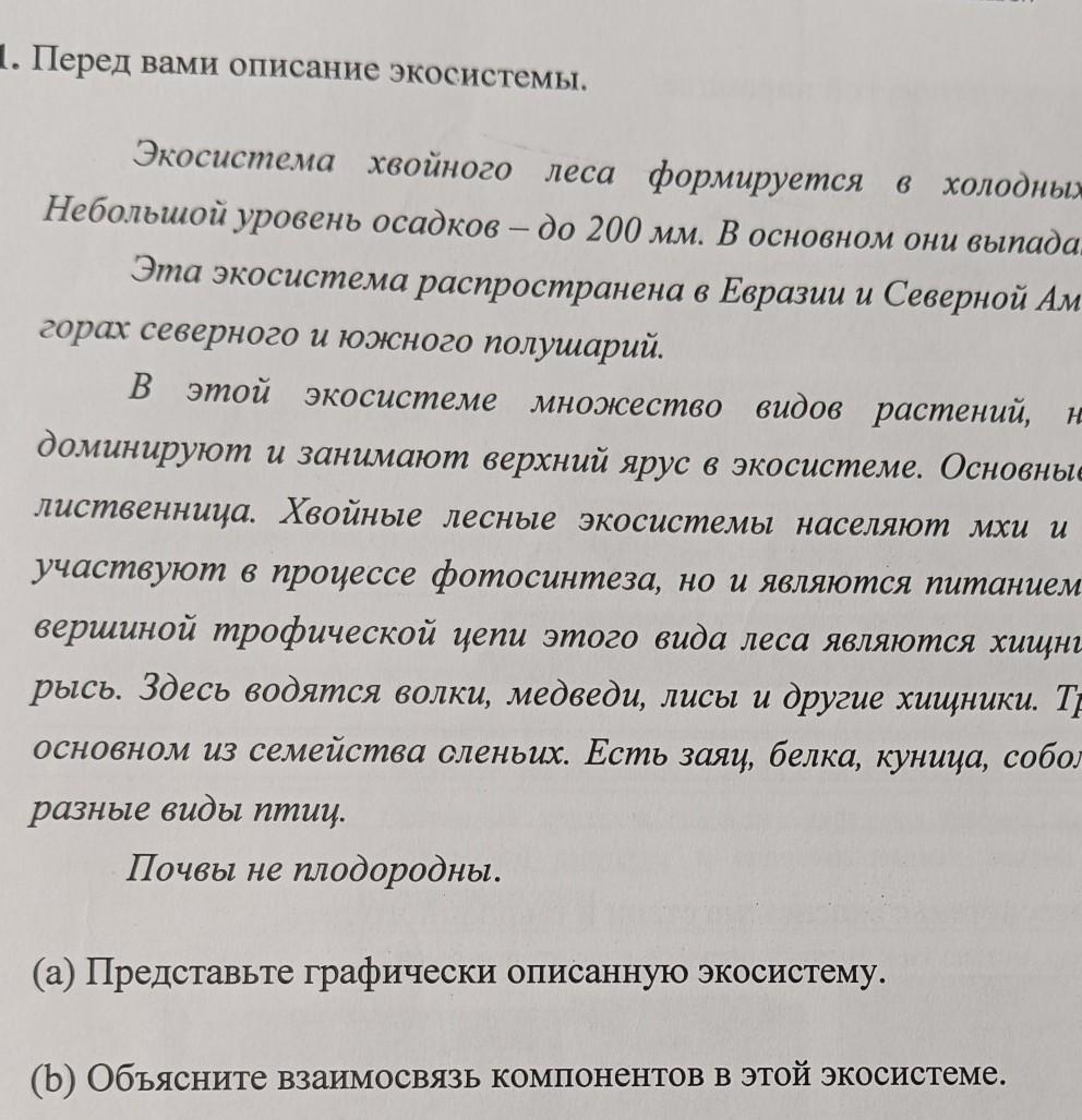 1. Перед вами описание экосистемы. Экосистема хвойного леса формируется в холодных климатических услов Небольшой уровень осадков – до 200 мм. В основном они выпадают в виде снега. Эта экосистема распространена в Евразии и Северной Америке, также встречаетс горах северного и южного полушарий. В этой экосистеме множество видове растений, но деревья хвойных по доминируют и занимают верхний ярус в экосистеме. Основные виды это: сосна, ель, ке лиственница. Хвойные лесные экосистемы населяют мхи и лишайники. Они не тол участвуют в процессе фотосинтеза, но и являются питанием для животных. Главным вершиной трофической цепи этого вида леса являются хищники, тигр, снежный б. рысь. Здесь водятся волки, медведи, лисы и другие хищники. Травоядные млекопитающ основном из семейства сленьих. Есть заяц, белка, куница, соболь, еж и древесный дикоб разные виды птиц. Почвы не плодородны. (а) Представьте графически описанную экосистему. (b) Объясните взаимосвязь компонентов в этой экосистеме. -