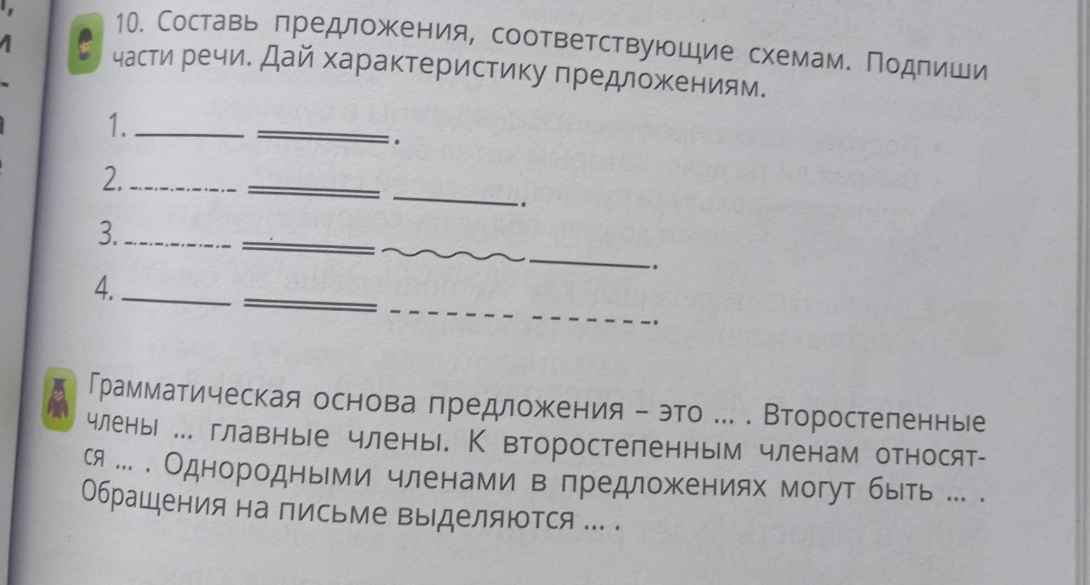 10. Составь предложения, соответствующие схемам. Подпиши части речи. Дай характеристику предложениям. 1. 2.... 3.... 4.- члены Грамматическая основа предложения - это ... . Второстепенные главные члены. К второстепенным членам относят ся ... . Однородными членами в предложениях могут быть ... Обращения на письме выделяются ... .